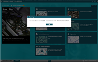 我们将 TAS2X63EVM 套件与 PPC3应用连接。 当我们打开应用程序时、它会显示一条消息、提示您有不同版本的 EVM。