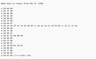 我尝试在 PPC 应用中将增益从5dB 更改为-10dB。 但我不明白"98 14 96"之后有哪些数据。 如何发送到 I2C.参数有什么用途? 我已经附上了图像。