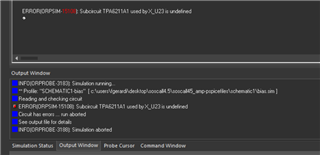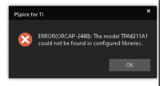 我 从 TI 官方网站下载了 TPA6211A1 SPICE 库、将其添加到了 PSpice 库中、但当我启动仿真时、出现以下错误(请参阅随附的图像)。