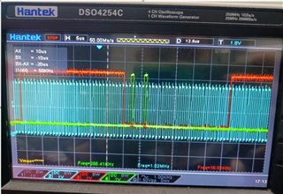 时隙宽度为32位、数据位为16位、如下所示。 红色为 FSYNC、蓝色为 SBCLK、绿色为 SDIN。 波形如下图: