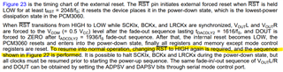 我相信 Peter 所问的问题来自 数据表的第16页:"当 RST 保持低电平至少 tRST = 2048/fs 时、RST 引脚启动外部强制复位"如果复位未保持2048/fs、可能会发生意外行为并且器件可能不会完全复位、从而导致您看到快速 DOUT 时间。