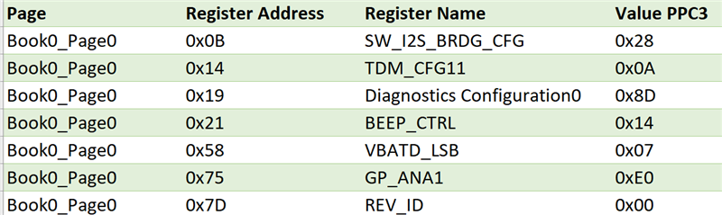 我使用了 TAS2781EVM 和 PPC3来创建工作配置并导出寄存器映射。 交叉查看数据表时、我注意到 PPC3导出的一些寄存器未记录在数据表中。 在对寄存器进行编程之前、我需要了解寄存器的影响、因此请提供以下寄存器的文档: