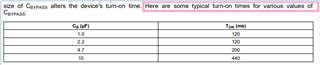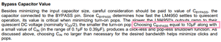 要考虑的其他事项是 Cybass 和 Cin 值。 在"优化卡嗒/爆裂声降低性能"部分、正确的组合将确保关闭或上电期间的喀哒声和噼啪声更少。 您需要足够高的 Cbypass 电容器和较小的 Cin 电容器来反映您的应用中所针对的闭环增益。 还有关于 CBYPASS 的选择如何影响接通时间的信息。 我在下面附上了图片。
