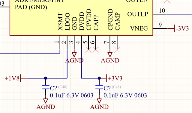 我想知道是否可以 向 VNEG (引脚9)提供-3.3V 电压、并让 CPVDD (引脚5)、CAPP (引脚6)、CAMP (引脚8)悬空