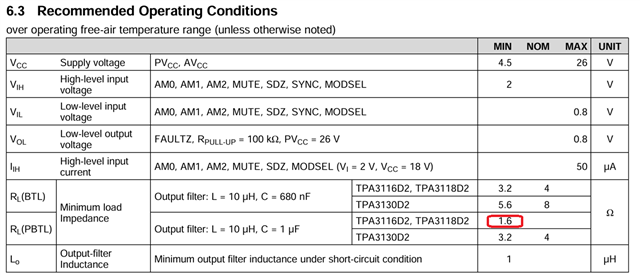 网页(https://www.ti.com/product/TPA3221)上的 TPA3221产品详细信息部分 表明最小负载为1Ohm、但数据表中未明确提供。