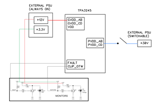 基本上只有将要打开和关闭的 PVDD、但 GVDD 和 VDD 引脚将始终具有12V 电压、以及用于故障的3.3V 电压 OTW_CLIP 指示器(指示器电路与 EVM 相同)。
