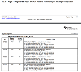 下面的寄存器可编程哪些输入连接到左侧 PGA。 您可以在此处选择要混合使用的源。 例如、由于 IN2L_P 用作麦克风、因此可以使用位 D5-4将该输入连接到左侧 PGA。