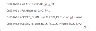 我不确定您是否有2.048MHz。 如果是、则最后两行可以互换使用。 如果 MCLK 是= 2.048MHz 的唯一时钟、则将寄存器0x66设置为0x02。