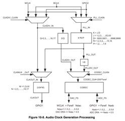 并且、时钟树显示 CODEC_CLK=256*Fsref。 如果 CLKDIV_IN=2.048、则在 Q=2时、fssref 可以是8k。 然后、CODEC_CLK=PLL 和2.048MHz 不需要。 我们还需要调整之前设置的寄存器、因为 FS 将保持 FS_ref