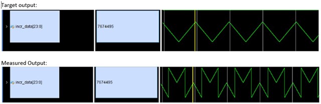 客户正在将三角数据从 FPGA 发送到 PCM1780。  每通道24位数据、序列为 24'h7F_FFFF~24'h00_0000、24'hFF_FFFF~24'h80_0000~24'hFF_FFFF、24'h00_0000~24'h7F_FFF... 这是从最大到最小的重复24位补码数据循环...