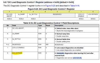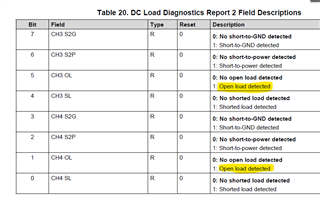 我们有兴趣读取寄存器0x0C 和0x0D 的直流负载诊断。 当我们将扬声器等外部负载连接到通道1、2、3和4 (用于前置和后置扬声器)时、将检测到电池短路、接地短路和直流负载开路、而不会出现问题。