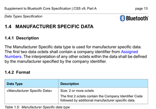 据我所知、标签 0xFF 之后的信息包含 2 个字节、这是特定公司的标识符。 根据这些标识符、其他器件(如果可能)可以正确读取以下数据、并以某种方式用于自身。 BLE 文档中提供了这些标识符的列表。 我们在线提到、此标签 (0xFF) 可用于调试目的。 在这种情况下、标识符可以是任意的。 但是、如果我们要将我们的设备用于商业目的(即销售)、则必须定义此标识符。 否则、其他设备可能会误解我们。 要获得唯一的标识符、似乎需要向 BLE 协会支付会员费。 这条道路不适合我们。 基于这些想法、我似乎无法使用这种方法。