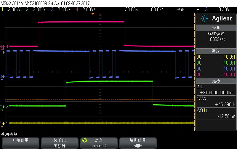 红线表示Rx callback LEDR_toggle (); 蓝色表示TX引脚, 绿色表示Tx回调 Ledg_toggle ();