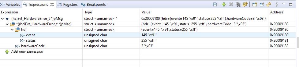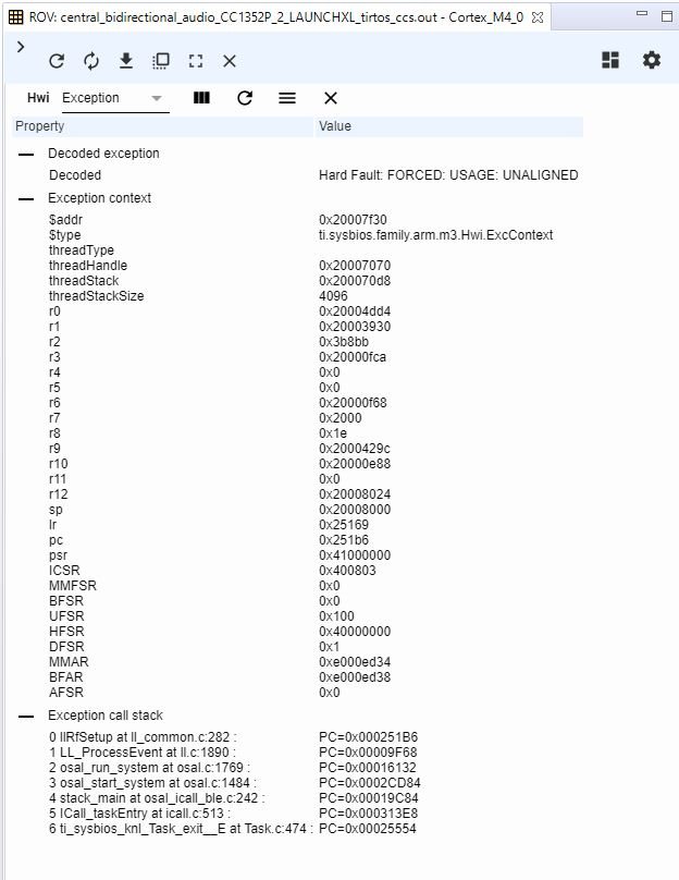 我不确定这是否是对某人有用的线索,但在使用 CCS 四处走动之后,我发现在启动之后的早期,代码会在  CentralAudio_processHCIMSg()中遇到 HCI_BLE_hardware_ERROR_EVENT_CODE 切换案例。 请参阅以下 HCI 事件错误结构的屏幕截图: