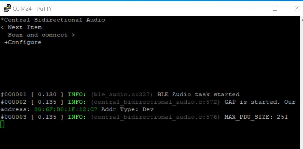我确认 launchpad 和音频 Booster Pack H/W 都可以正常工作、因为我能够从 SL 音频插件成功运行音频回声演示。  我还可以在此 Launchpad 上通过 simplelink_cc13x2_26x2_SDK_3_30_00_03成功运行简单的中央示例。 该板可通过该演示正常工作、包括按按钮进行菜单导航以及射频扫描等