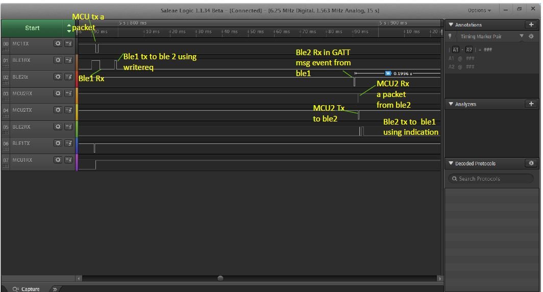 我们能够在不丢失数据的情况下实现双向通信。 但是、连接后的数据通信时间大约为190到200ms。 BLE1到 BLE2花费80到90ms、反之亦然。 BLE1是中央器件、BLE2是外设。 时序详细信息附在此处。