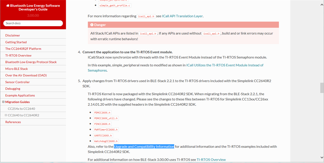 如果您安装 simplelink_cc2640r2_sdk_1_00_00_22、请参阅文件://C:/ti/simplelink_cc2640r2_sdk_1_00_00_22/docs/blestack/html/cc2640/ble-sdg/cc2640-to-cc2640r2.html 下的产品介绍指南