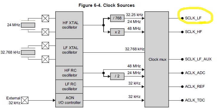 第418页显示了 SCLK_LF 的时钟多路复用器。 我已经检查了寄存器来验证哪个时钟在 SCLK_LF 上复用。
