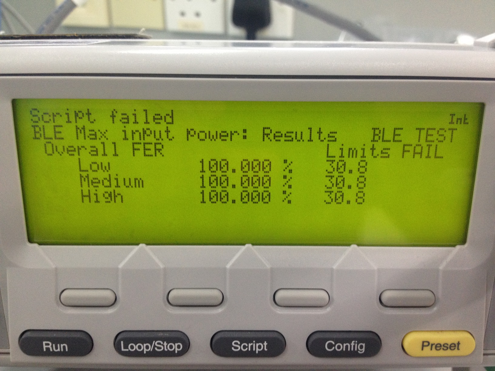 我使用 SDK v1.30和 SDK v1.35中的主机测试示例程序执行了直接测试模式。 这两项测试都失败了很多。 下面是 SDK v1.35中 DTM 的结果。 我的同事说 BLE 灵敏度测试失败是一个问题。 我使用的是 Anritsu BLE 测试仪。 DTM 是否需要执行任何建议的设置或设置才能通过所有测试。
