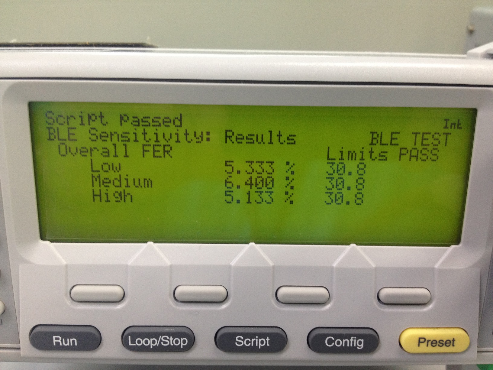 下面是 Anritsu BLE 灵敏度通过结果。 使用 host_test 的测试结果与使用 SDK v1.30和 SDK v.5.2的测试结果有所不同。 SDK V1.35中的 host_test 具有较高的错误百分比。 我怀疑这是因为 Anritsu BLE 测试仪不支持 BLE 5。