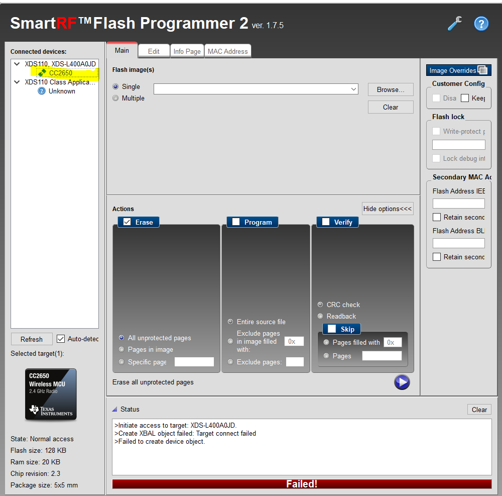 我正在使用 SmartRF 闪存编程器2、使用具有 XDS110的 CC1310LauchPad 对定制硬件进行编程。 使用 SmartRF 闪存编程器2可以看到 CC2650的定制硬件、但无法对其进行擦除或重新编程。 我在第一次执行该操作、但在执行强制批量擦除之后、我无法再次重新编程