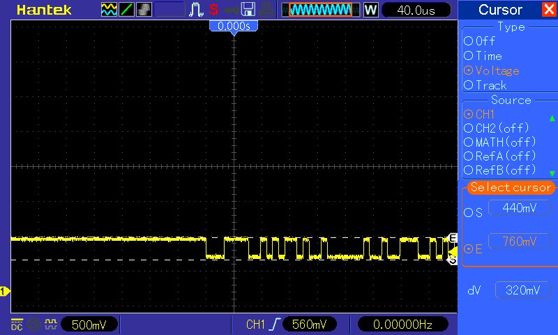 这是弱 UART 信号的图片。 您可以看到信号介于440mV 和760mV 之间。