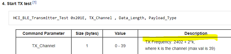 他们声称"HCI_BLE_Transmiter_Test"命令发送错误的频率(被1MHz 移位)、这意味着 TX 频率:2402 + 2*k - 1
