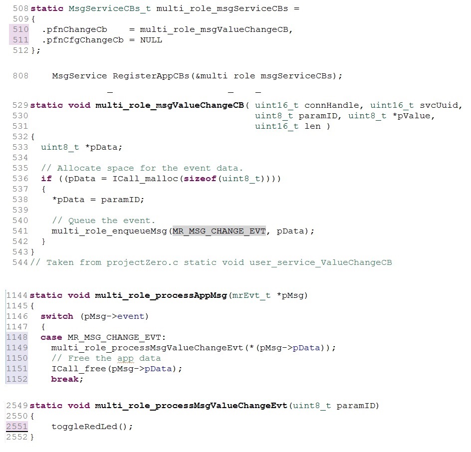 我想我应该定义一个事件 ID 并使用 multi_role_enqueueMsg (EVT、pData)、并从将从 multi_role_processAppMsg (mrEvt_t * pMsg)调用的其他函数中打印我需要的内容、但这也不起作用。
