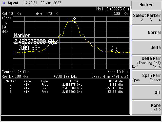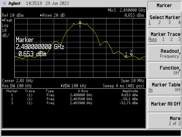 在执行 FCC 程序时、我们面临2Mbit 模式的高信道(2480MHz)的频带边缘测量存在问题。 裕度超出限制2.3dB。 测量是在我们自己的实验室进行验证的。 作为参考、我在 TI SDK 电路板 CC2652R1上进行了相同的测量、并在几分之一 dB 范围内获得了相同的结果。