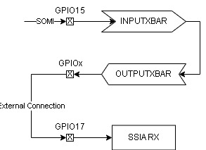 我遇到了从不同的非标准 GPIO 路由 UART RX 和 SSI RX 信号的问题、例如、我需要将 SOMI 信号路由到 SSIA RX 端口、但它以物理方式连接到 GPIO15 而不是 GPIO17。