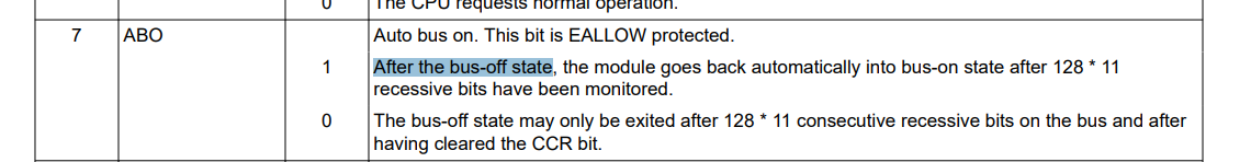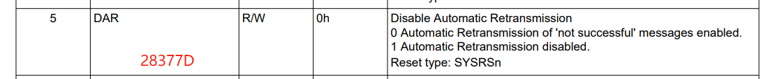 当前客户 (CosMX) 设置 CAN 周期性 100ms 发送数据。 ABO 总线自恢复功能已启用、因为 CAN 总线可能会受到挂起死区情况的干扰。 CAN 总线恢复后、客户是否可以在没有成功数据的情况下继续重新传输? 还是需要等待下一个周期 100ms 重新传输? 我们 查看了 28069 手册、但找不到不允许重新发送的相应函数。 我看到 28377 不允许重新发送、但 28069 找不到、因此请 帮助确认。 谢谢。