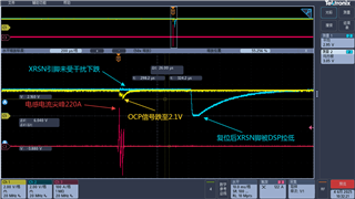 我的客户在其 EV 充电站电源模块上使用 28P55。 我们发现 大电感电流会导致 DSP 复位。 测量的波形表明、这种干扰不会影响 XRSN 引脚、不会触发 TZ、并且 VDD 和 VDDIO 引脚上的 3.3V 电压也稳定。 波形如下图:
