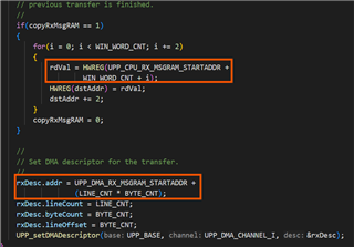 2.在条件的 else 部分 (eowcount%2) 的描述符中修改起始地址的逻辑与 RxMSGRAM 的填充方式不同。 请参阅下面的屏幕截图、我摘自示例代码。 根据我的理解,它应该是相同的。 您能对此做一点澄清吗?