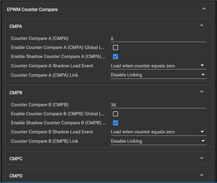 我正在尝试使用 LAUNCHXL-F280049C 为半桥生成输出。 我基本上需要生成具有 500kHz 频率、30%占空比的 EPWM_A、并生成与 EPWM_B 互补的 EPWM_B、两者之间具有 2 个时钟周期死区。