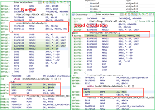 在比较两个程序运行期间的程序集代码后,发现存在细微差别,但我不知道如何解决,如图所示。