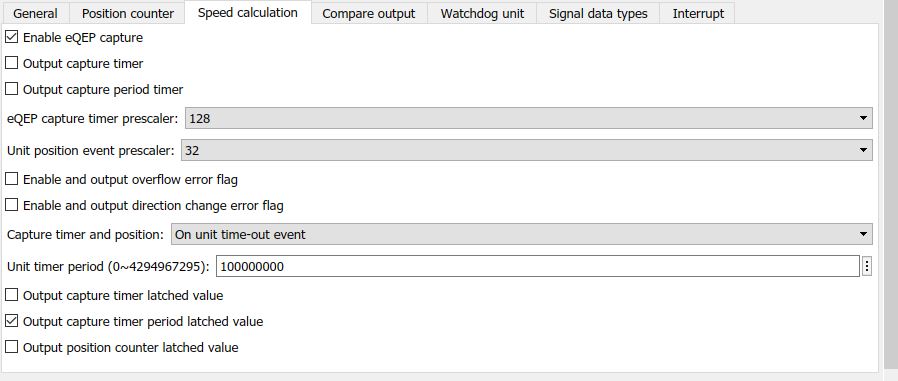 我需要使用eQEP [Simulink]从编码器计算速度。 我已经读 过eQep_sprug05a,但我不能说我明白到底该做什么。 我有一个2000 [额定转速]马达和 一个增量转速计,每转可产生1024个脉冲。 我尝试配置eQEP,但所有寄存器都是零[CCSv6, Real Time ]。