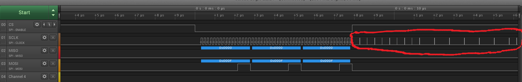 您好,我正在尝试设置连接到Launchpad XL-F2.8377万S上的接头J5 J6的SPI通信。 连接器连接到微控制器的spiB端口,并将GPIO63连接到GPIO66以实现高速SPI模式。 由于未知原因,在第一次事务处理后,SCLK引脚(J5引脚47)会在事务处理结束后以随机频率持续发送短脉冲。 如下所示。 当发生多个事务时,这些脉冲会产生问题,因为它们会在SCLK信号的下一个SPI帧中产生故障。