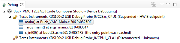 您似乎正在取得进展。 使用F2.8379万D时,您需要检查"C28xxCPU1 ",如果使用CLA,还需要检查"CPU1_CLA1"(闪存编程由.cmd文件中分配的内存部分确定)。 请注意,“没有可用的源”“0x3fe493”不是错误,而只是CCS让您知道“C”源不可用。 此代码部分位于引导ROM中,需要加载符号才能查看"C"源。 如果您查看"反汇编"窗口,则应找到汇编代码。
