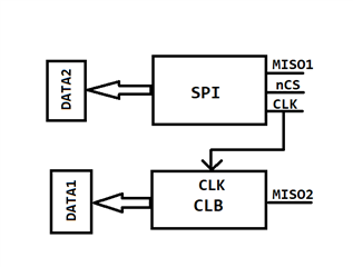 感谢您的回答。 然后、这是我的另一个问题。 我使用 SPI 和 CLB 同时从2个 SPI 从器件读取数据。 因此、基本上我使用 CLB 内部的计数器作为移位寄存器、并将 SPI 的时钟连接到移位寄存器的时钟。 然后、我将移位寄存器的输入命名为 MISO2。