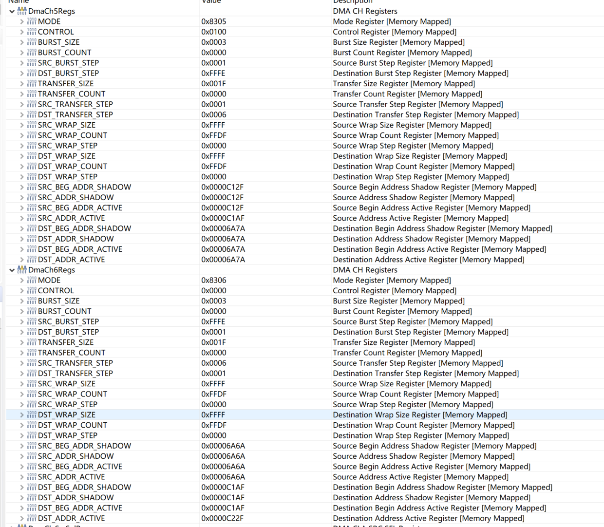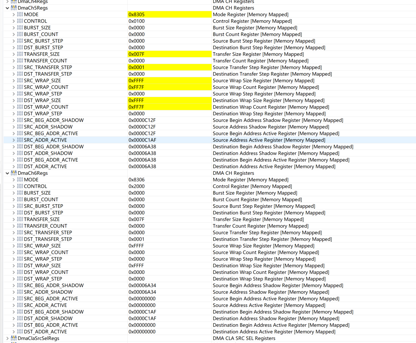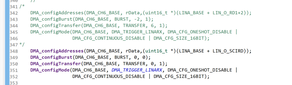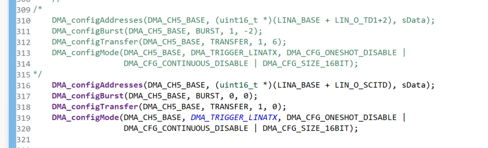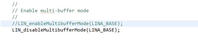 我的一个客户参考例程(LIN_ex3_sci_DMA)将 Lin 模块配置为 SCI 使用。 在该示例中、使用了多缓冲模式、需要进行修改以禁用多缓冲模式。 但是、在更改为禁用多缓冲器模式后、SCI 无法启动 DMA。 问题可能出在哪呢? 下面是他更改代码的位置: