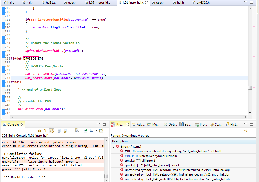 奇怪的是、CCS 抱怨在索引中明显实例化 RDK3.1 eabi 项目时缺少符号。 它似乎与定义删除的 DRV8320_SPI 相关、然后将其添加回任何实验项目中。