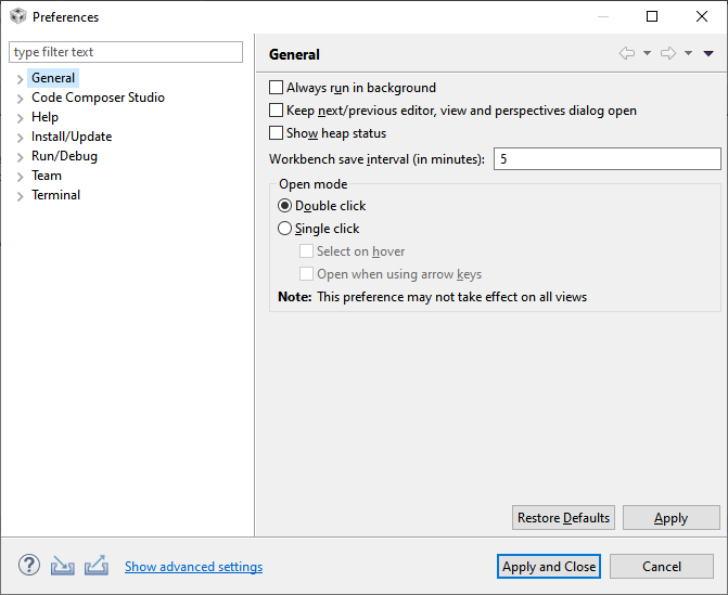 我正在使用 CCS 9.1.0.00010,并在输入制表符时尝试设置制表符大小。 在“窗口->首选项”中,在“常规”->“编辑器”->“文本编辑器”下,我可以修改“显示的标签宽度”和“为标签插入空格”。 但是我找不到一个地方让我可以在键入选项卡时更改其大小。 我应该去别的地方吗?