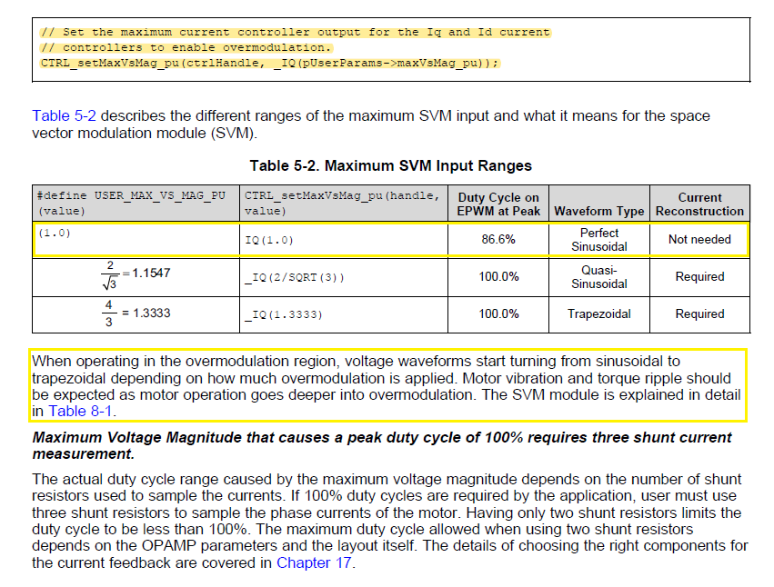 除了这一最大电压矢量幅度的定义之外、还可以更改控制器对象的成员、以允许更改电流控制器的输出、即空间矢量调制(SVM)的输入。 这一点很重要、因为即使在 user.h 中将最大电压矢量幅度定义为最大值1.0 (或100%)、SVM 的输入也可以高达4.0/3.0 = 1.3333 (允许过调制)。 SVM 中高于1.0的输入位于过调制区域。 2/SQRT (3)= 1.1547的输入是正弦波的波峰值达到100%占空比的地方。 输入 为1.3333时、SVM 发生器会生成梯形波形。 以下代码示例将电流控制器的输出更改为1.3333、允许最大过调制: