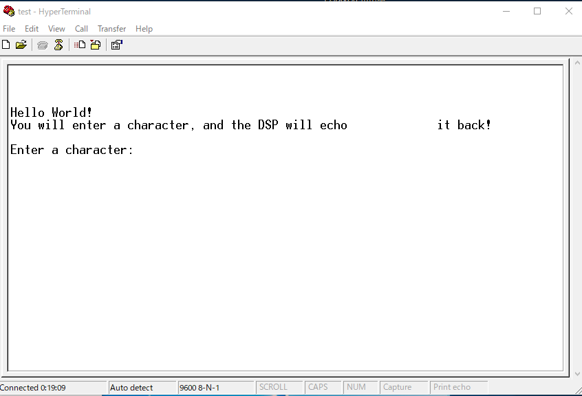 由于您在 HyperTerm 上看到了此对话框、这意味着 C2000已成功将此消息传输到 PC (这意味着波特率也是正确的)。  我不知道为什么您无法输入字符、但我认为此时我们已确定通道/连接良好。