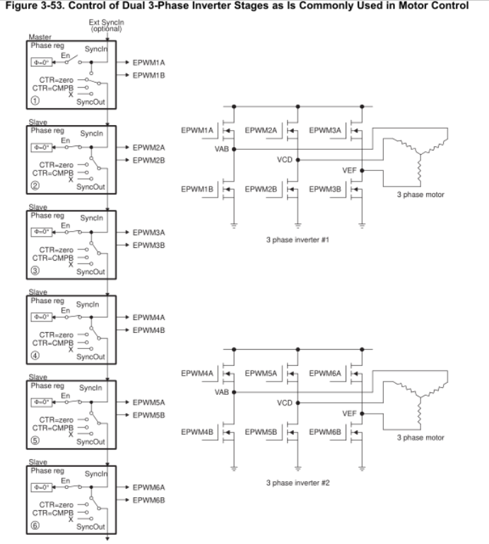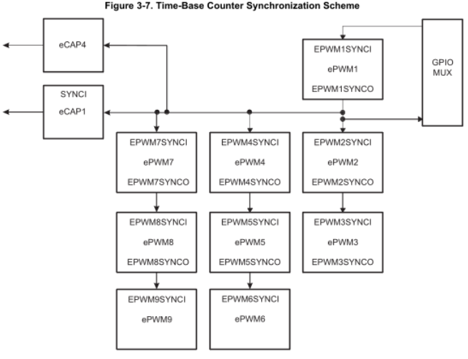 在 图3-7 ( 《TMS320x2833x 技术参考手册》第232页)中,EPWM4SYNCI 似乎连接到了 EPWM1SYNCO。
