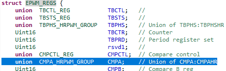 ePWM_reg 结构中的一个联合体的类型为"cmpa_HRPWM_Group"(在上面突出显示)。 该联合体包含一个"cmpa_HRPWM_REG"类型的结构、该结构别名为助记符"half"、这是您在上面询问的问题。