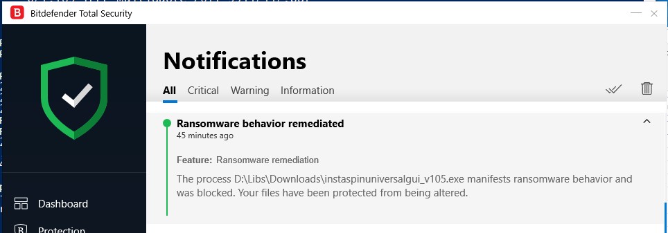 流程 D:\Libs\Downloads\instaspinuniversalgui_v105.exe 会显示勒索软件行为并被阻止。 您的文件已受到保护、不会被更改。