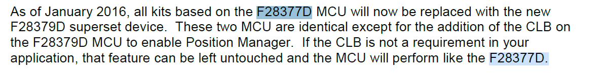 该文件的名称是 F28377D、因为该器件是最先发布的、而 controlCARD 最初使用了该器件。 这些设计是相同的、仅因为 U1组装的器件而异。 请参阅用户指南的以下摘录。