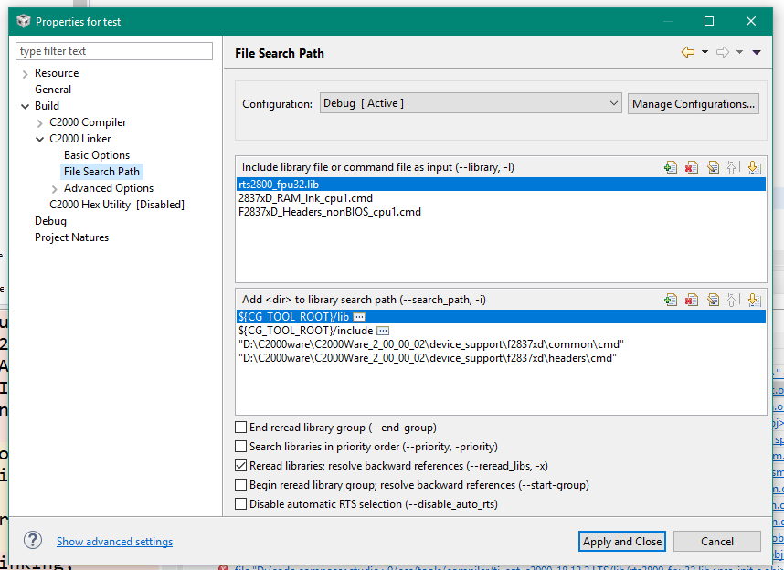 基于 C2000ware\C2000Ware_2_00_00_02\device_support\f2837xd\docs\F2837xD_dev_user_guide 以创建新项目、我添加 common\cmd 和 headers\cmd、然后添加 rts2800_fpu32.lib、2837xD_RAM_lnk_CPU1.cmd 和 f28xD_libc.cmd;最后删除 rts2837xD_BIOS_libc.lib