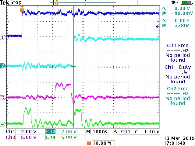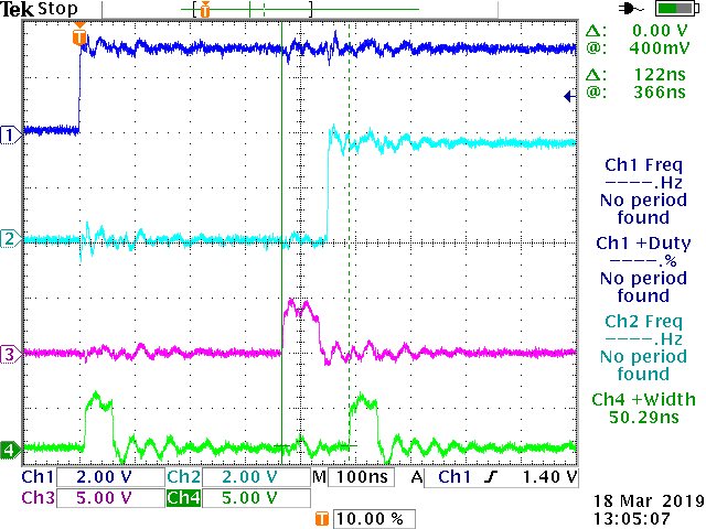 下面的两个示波器图显示了通道3的上升沿(CMPSS1)和通道4的上升沿(EPwm8b)之间存在一致的122ns 延迟。  这两个图之间的区别在于、我在第一  个(13:05:07)和第二个(13:05:41)图之间人工扩展了通道3下降沿。  延迟一致这一事实告诉我 XINT4已正确设置并在上升沿触发。  我不理解的是122ns 延迟。  上面的汇编代码会考虑25ns 左右的时间、当然会有一些传播延迟、但我希望远小于示波器图中显示的接近100ns 的时间。  有什么关于这是为什么的想法吗?